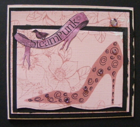 Stazon Jet Black to ink the stamps, witch stamp is TCRS, bumpkins and flourishes is by Inkadinkado. I used Tim Holtz Distress Inks, Stormy Sky and Tattered Rose to create and blend the background.